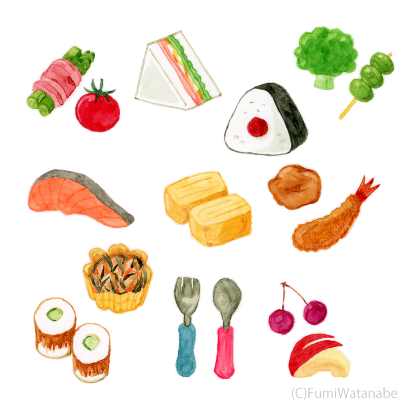 透明水彩で「おべんとうのおかず」のイラストを制作しました