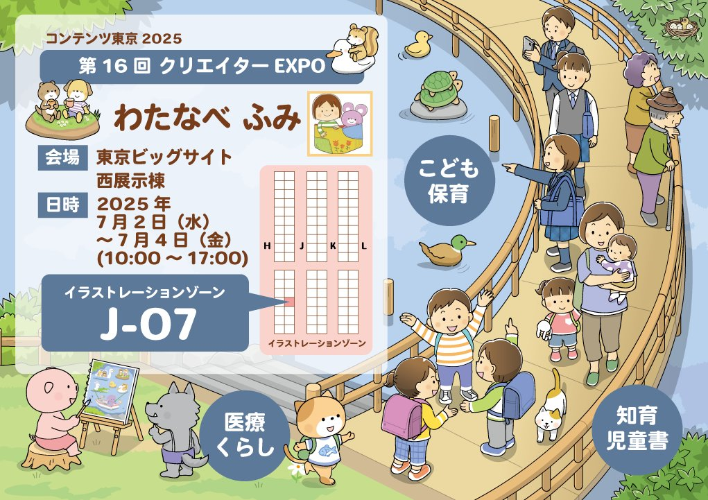 ブースでは、これまで手がけたお仕事や、子供向け・教育系のイラストなどを中心に、新しく作ったポートフォリオを展示・配布予定です。出版社や制作会社のご担当者さま、私のイラストに興味のあるかたもぜひお気軽にお立ち寄りください。
