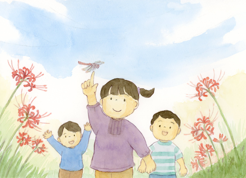 彼岸花と子どもたちのイラストです